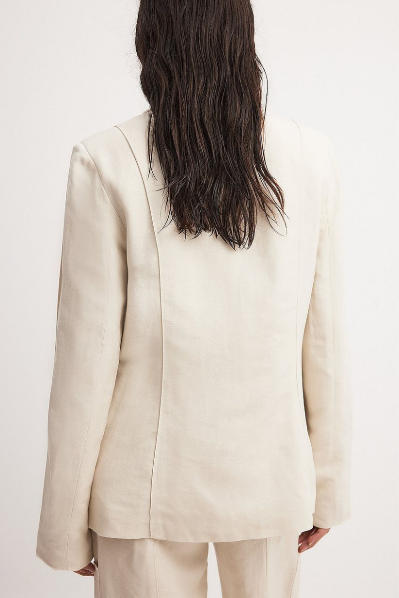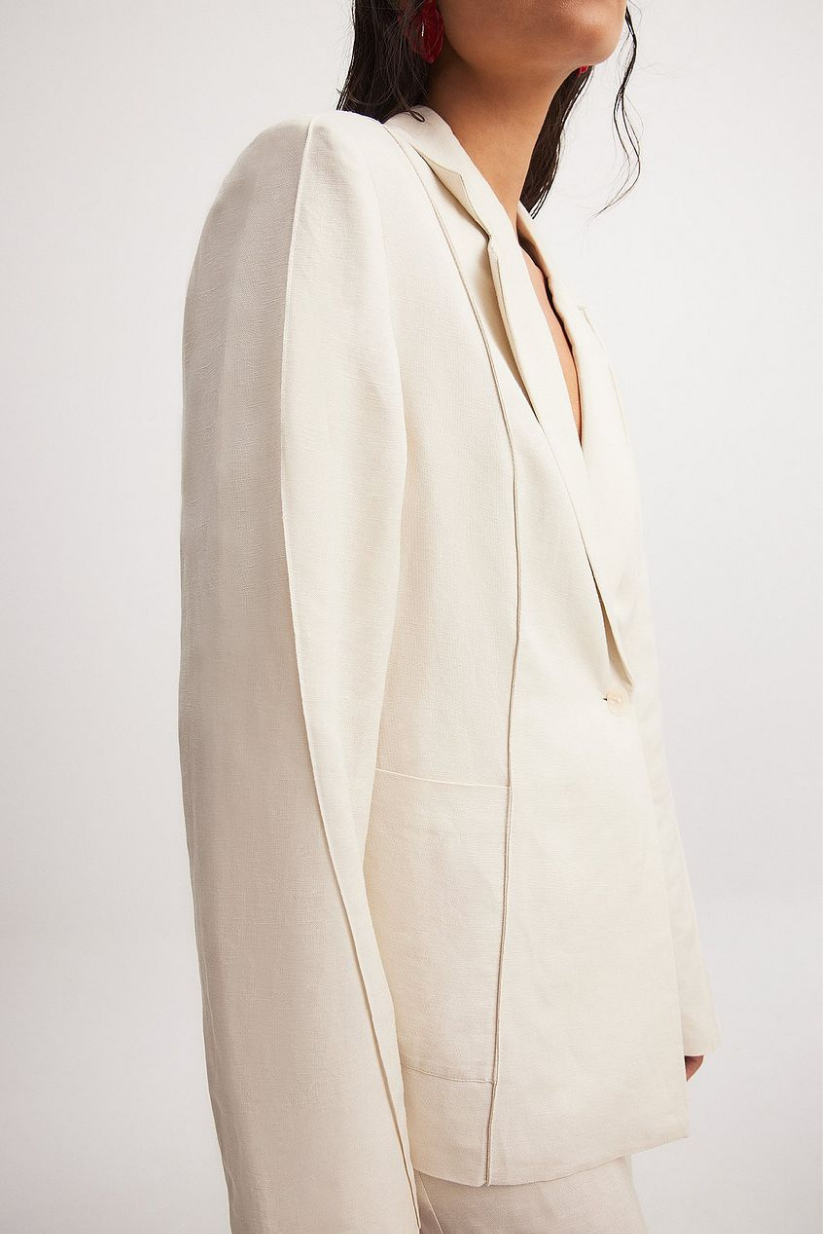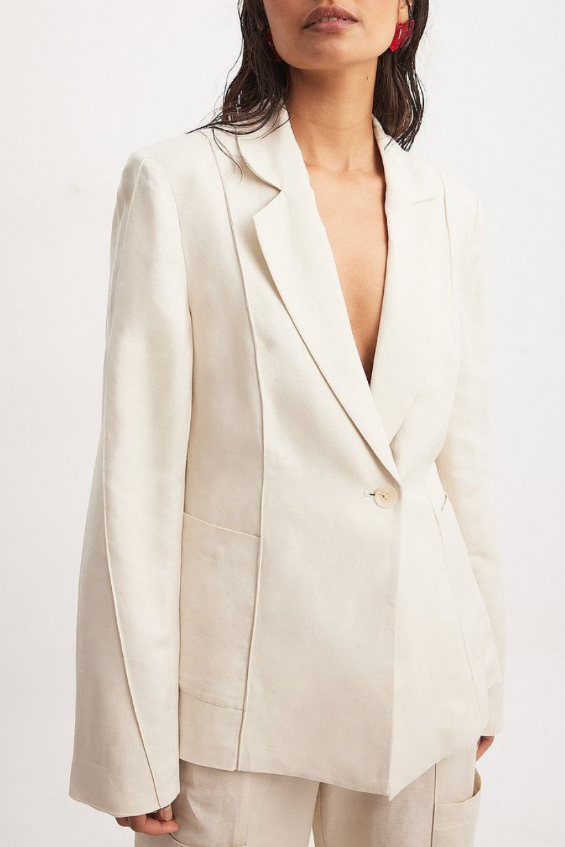 This structured yet breathable blazer comes with padded shoulders, a sharp lapel neckline, and a flattering single-button closure. Designed in a premium linen blend, it delivers the perfect mix of power dressing and effortless wearability.