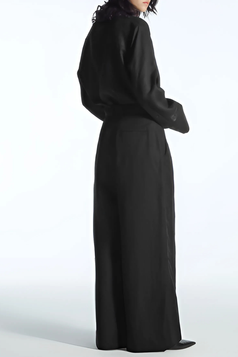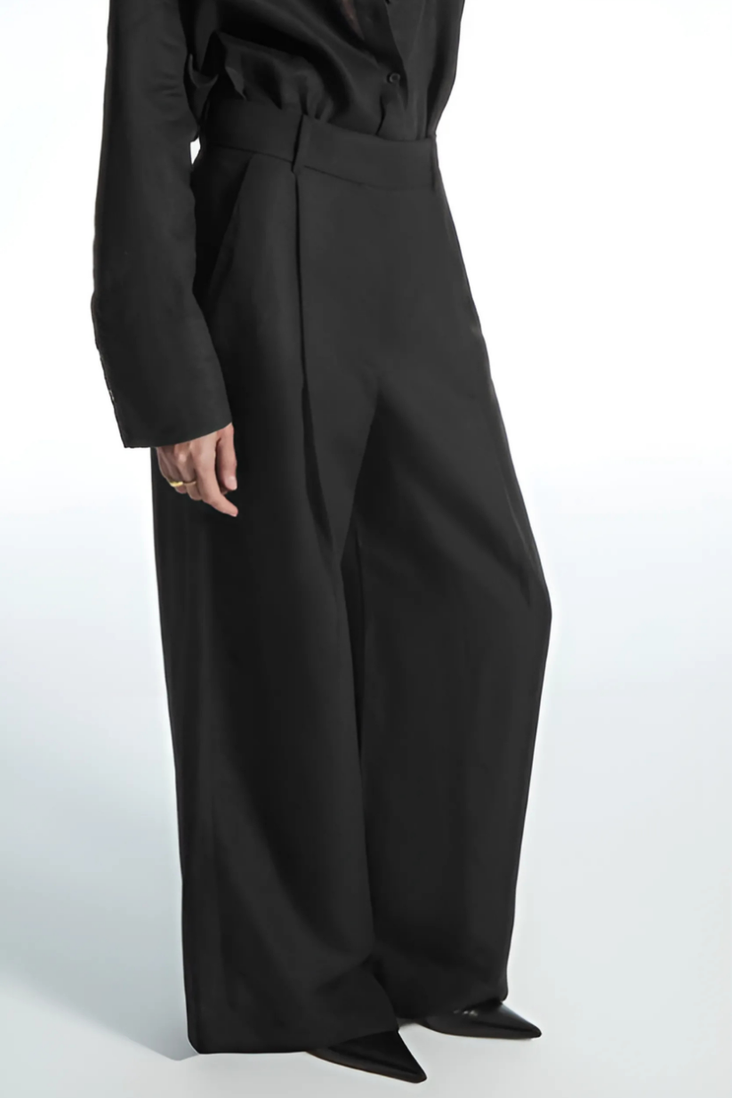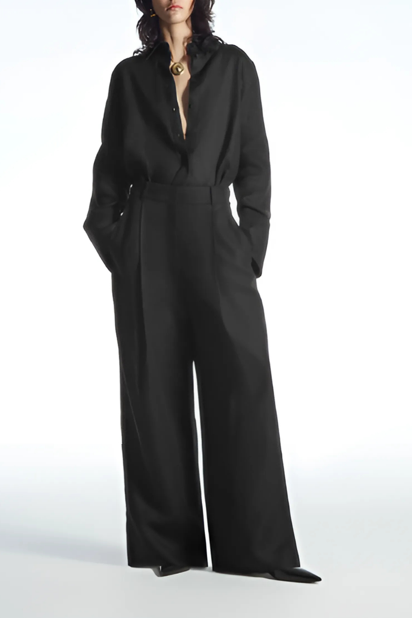 These high-waisted black linen trousers feature sharp pleats and a wide-leg silhouette that elongates the frame. Designed to pool elegantly at the hem, they’re your ideal black wide leg trousers for a polished yet comfortable workday.