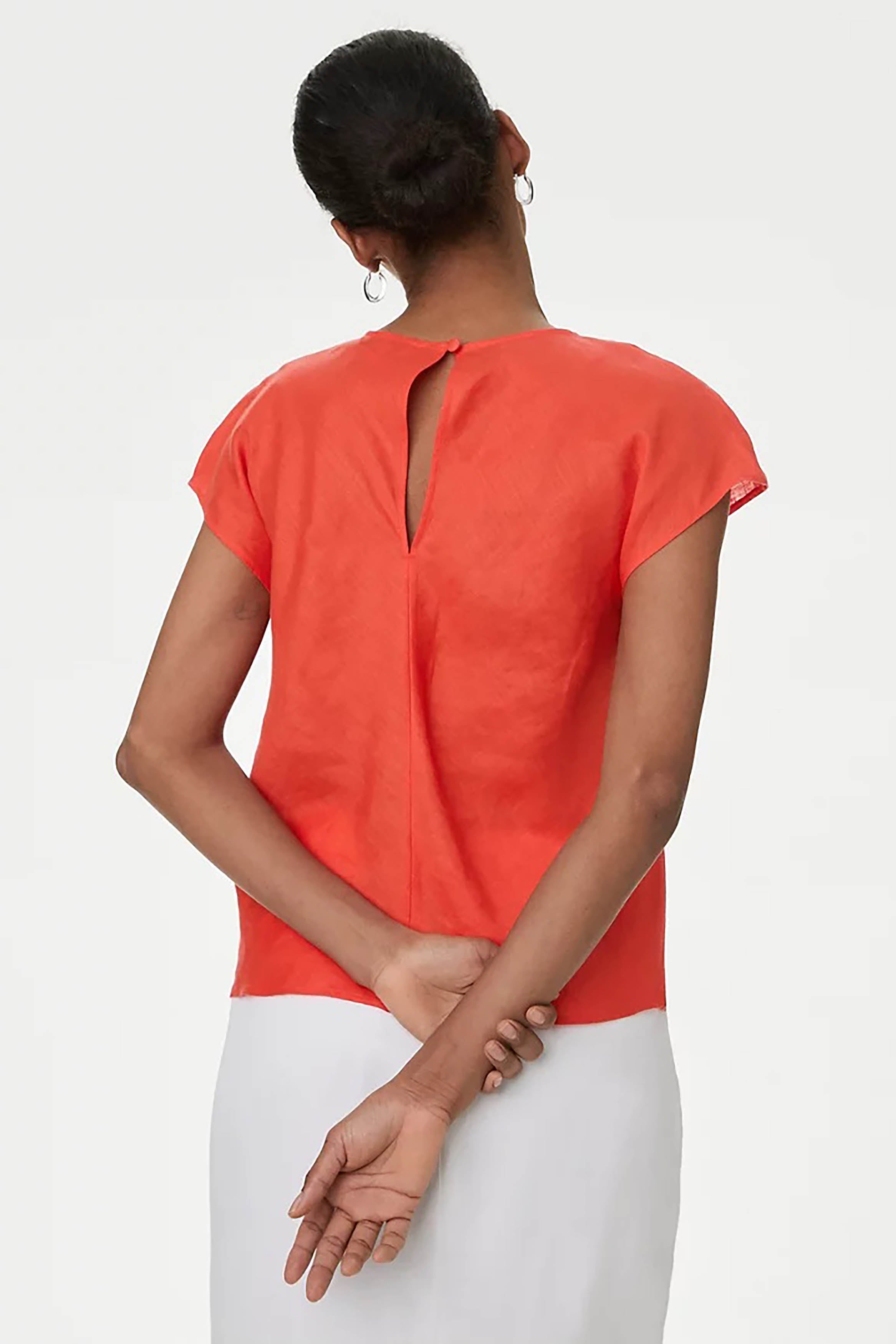 Such a vibrant top! The orange color is perfect for brightening up my work wardrobe, and the linen fabric feels amazing.