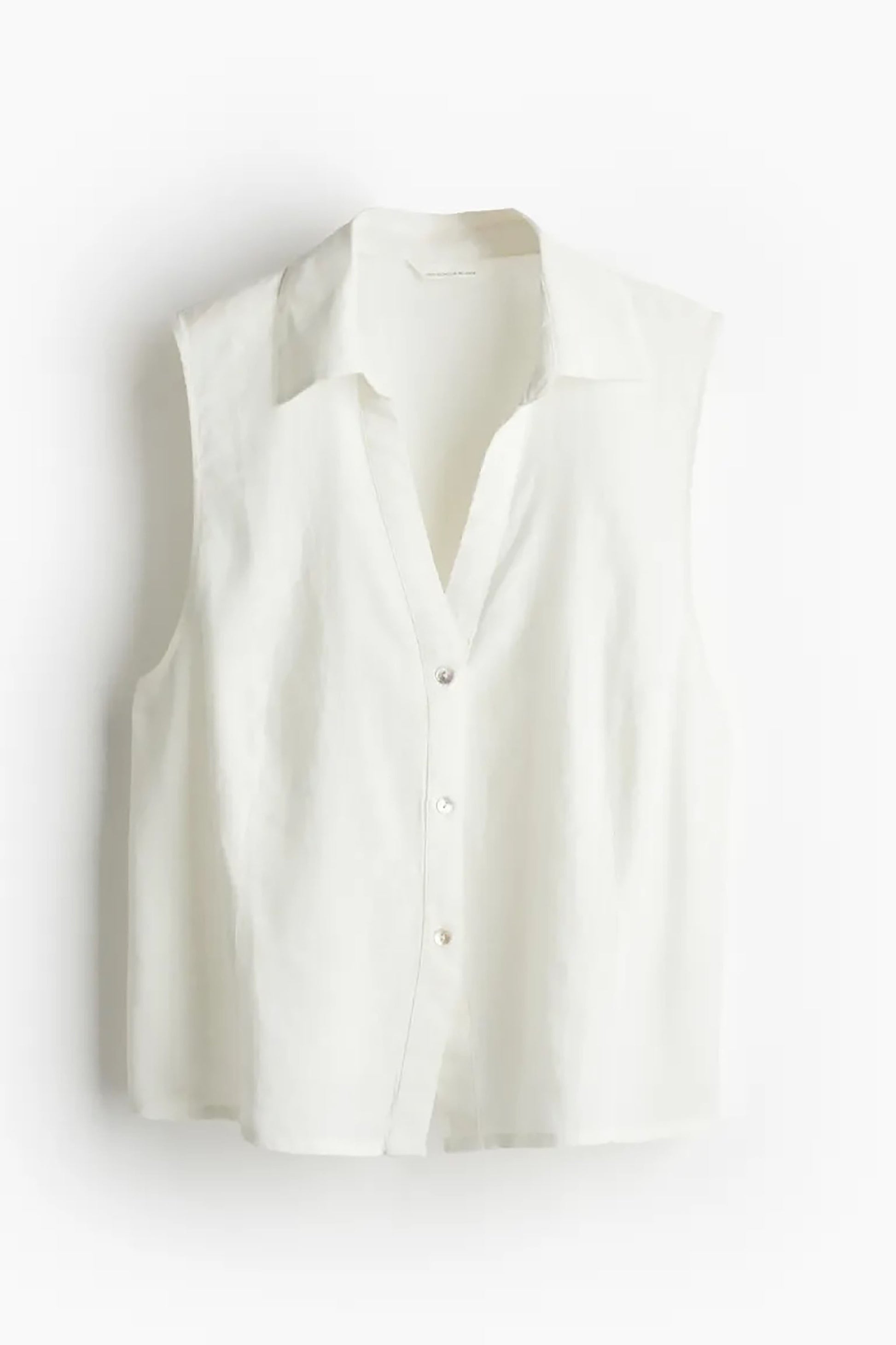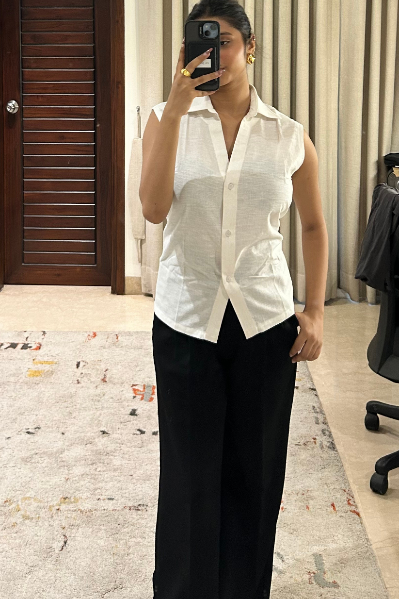 This shirt redefines elegance with its sleek sleeveless design and classic collar, effortlessly blending style with comfort. The button-down silhouette adds a touch of sophistication, while the premium linen-blend fabric keeps you cool all day long. Perfect for layering or wearing solo, this shirt is your ultimate go-to for chic, confident, and effortless workwear.