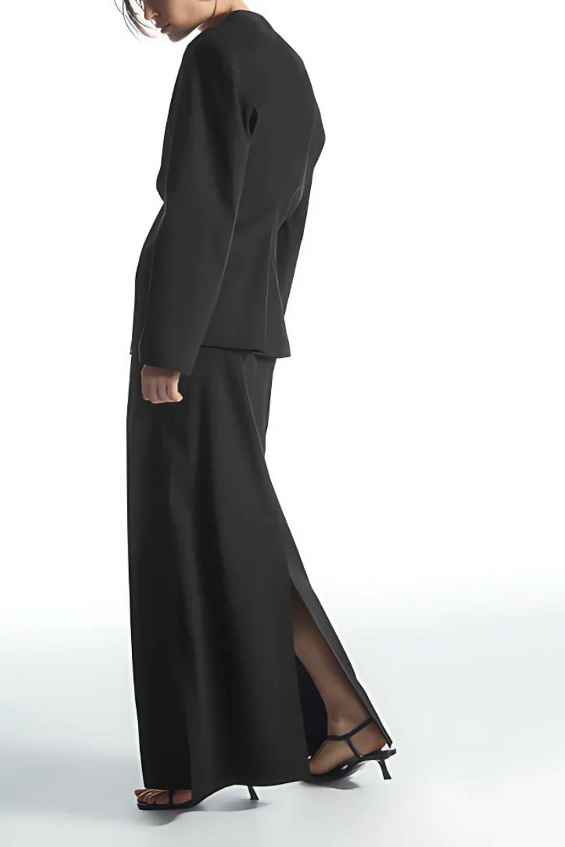 This collarless black blazer is cut with a slim, fitted waist that shapes and defines your silhouette. Crafted with precision seams and a clean hem, it’s the perfect piece to mix, match, or wear as part of this co-ord set.