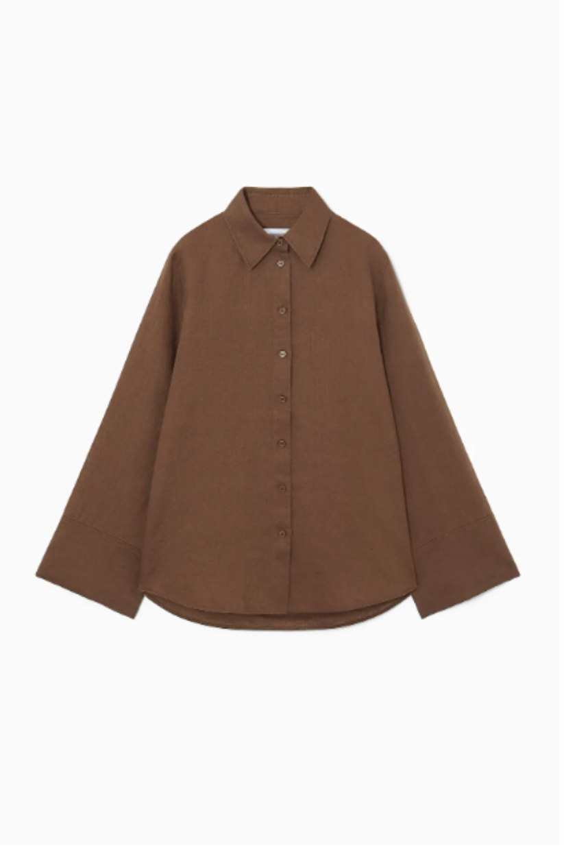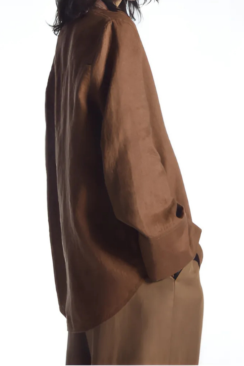 Crafted from breathable linen, this rich espresso-brown shirt features a neat pointed collar, subtly curved hem, and wide sleeves for a slightly exaggerated silhouette that makes a statement without sacrificing comfort. A true spring–summer workwear essential, it’s designed to pair effortlessly with the matching trousers or other wardrobe favourites.