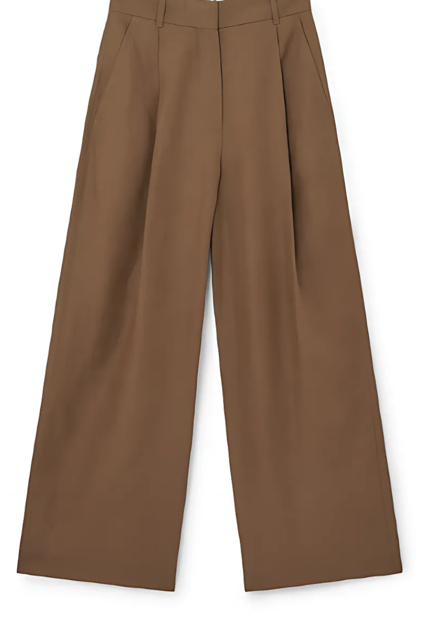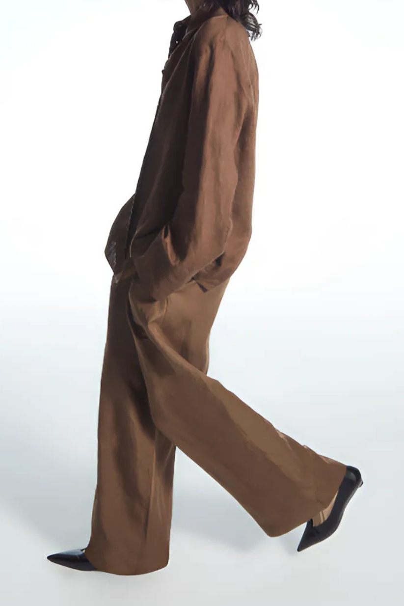 The high-waisted brown linen trousers are tailored with front pleats to elongate the wide-leg shape, creating a fluid, elegant drape. Full-length hems skim the floor for an elongated look, while the breathable linen keeps you cool all day. Whether worn as a linen shirt and pants set or styled separately, these trousers bring effortless sophistication to any outfit.