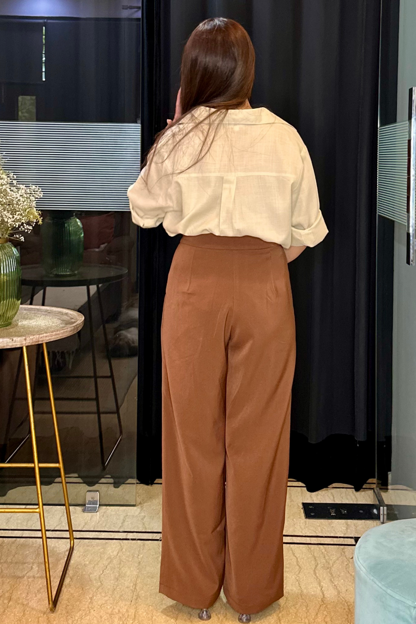 Elevate your wardrobe with POSE’s brown wide leg pants for women, tailored with a chic high waist and elegant pleats for a polished look. Designed in a wide-legged silhouette with functional side pockets, these brown formal trousers combine style, comfort, and practicality—ideal for confident professionals. Pair with blouses, blazers, or waistcoats for versatile office-to-evening outfits.