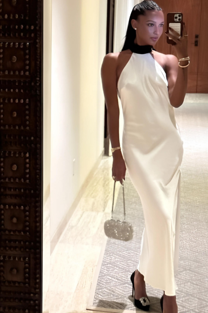 Egg-White Contrast Collar Long Dress