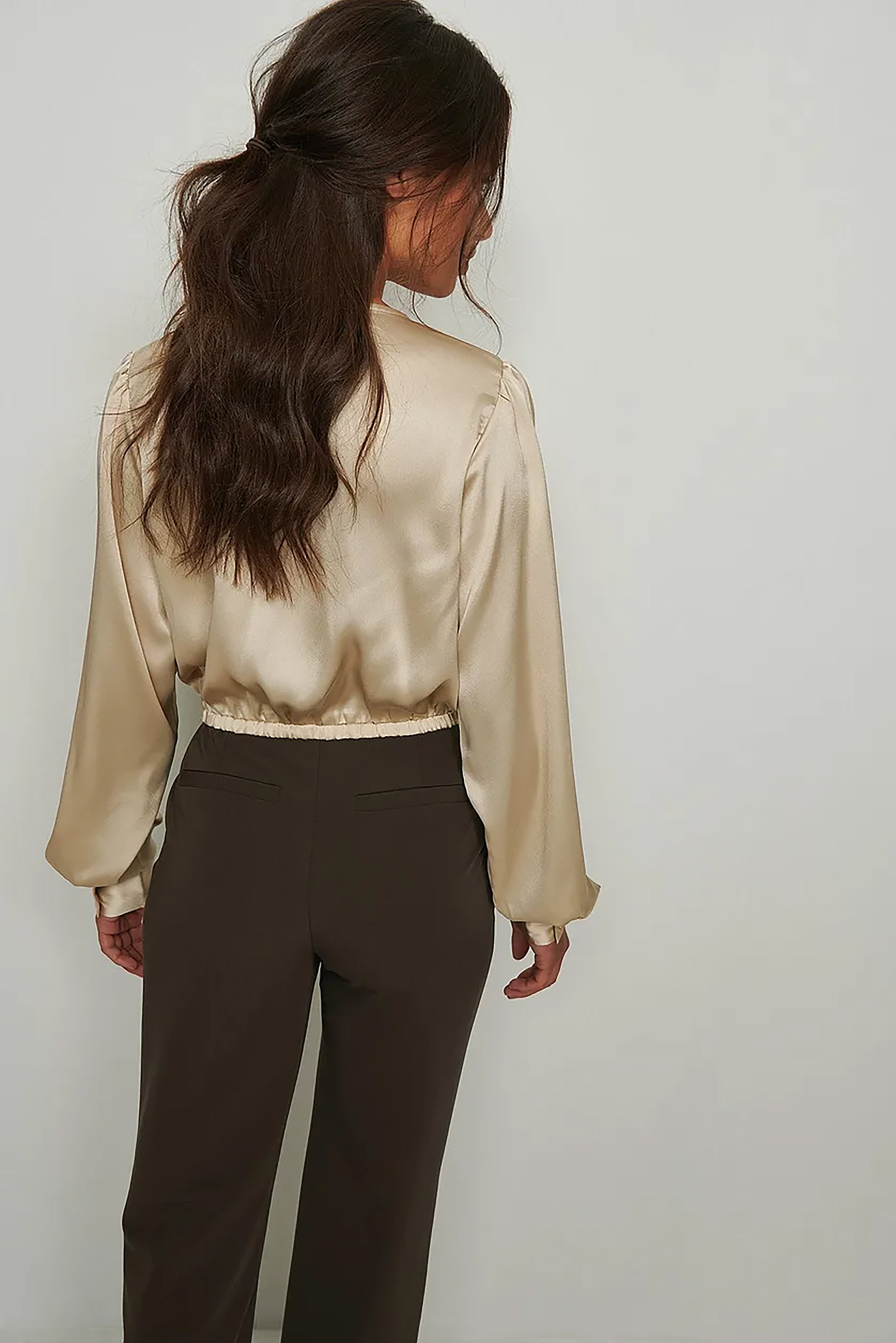 This trendy V-neck blouse design in elegant cream satin features an overlap cut, puffed sleeves, and a stretchable bottom for all-day comfort. Its modern silhouette works perfectly for professional settings while offering versatility for after-work occasions. Style it with high-waist trousers or pencil skirts for a refined, fashionable look.